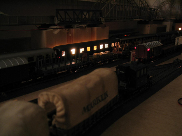Nachtszene in Bahnhof 1 (Oh Mist, meine Frau hält mir gerade eine Prospekt vor, da hat sie eine Dampflok (BR 50) mit so einem Kabinentender gesehen und erklärt mir nun, die will sie auch haben. 230 Euro sagt das Prospekt) Was wollte ich sagen...ehem...nein...nein, jetzt holt sie auch noch den Märklin Gesamtkatalog raus!